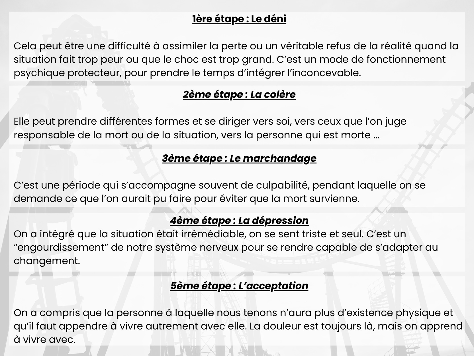 La psychiatre Elisabeth KĂŒbler-Ross, spĂ©cialisĂ©e dans lâaccompagnement des personnes en fin de vie et des soins palliatifs, a conceptualisĂ© un modĂšle de processus psychologique du deuil en 5 Ă©tapes.